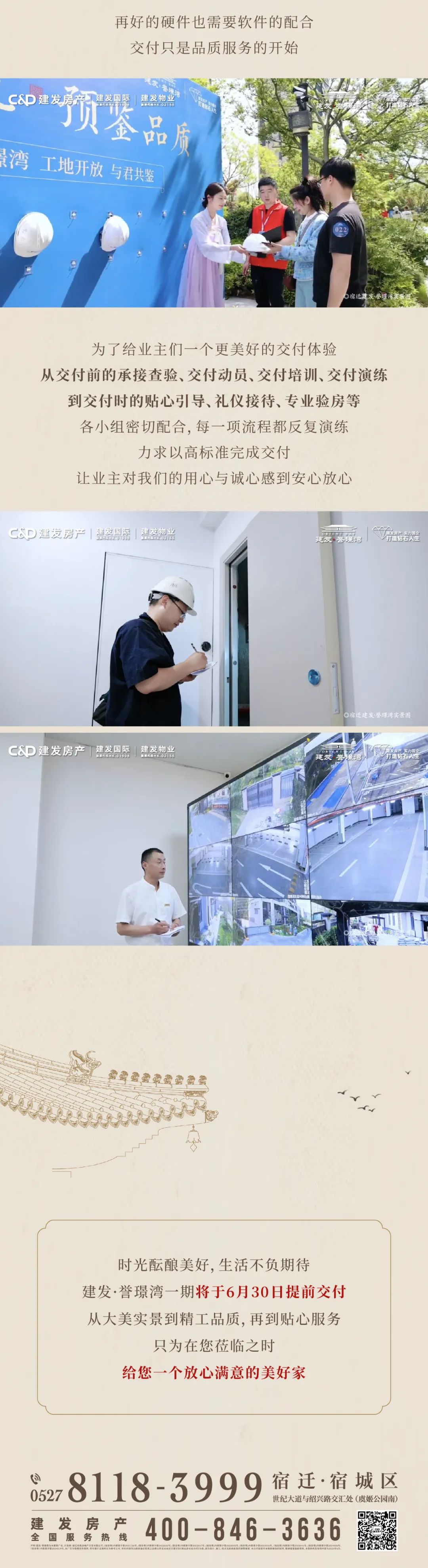 项目名:“宿迁建发誉璟湾“。文中所有内容及资料信息来源截止至2024年6月,仅供参考。本广告所有图则及文字仅供参考,广告信息如有变更,不再另行通知。本宣传不对学区及入学条件做任何承诺,学校划分及入学条件以政府相关部门最终批准方案为准。本宣传资料仅为要约邀请,相关内容不排除因政府相关规划、规定及开发商未能控制的原因而发生变化。对项目周边环境、交通、教育商业及其他配套设施的介绍,旨在提供相关信息,不意味着本公司对此作出了承诺,买卖双方的权利义务以合同约定为准。本资料部分素材来源于网络,其著作权归原作者所有;如果原作者表明其身份要求本公司停止使用该素材的,请及时与本司联系。本公司保留对宣传资料修改的权利,敬请留意最新资料。制作时间:2024年6月。开发商:宿迁兆悦房地产开发有限公司。预售证号:(宿房售)内销准字第2021126号、(宿房售)内销准字第2022022号、(宿房售)内销准字第2022037号、(宿房售)内销准字第2022045号、(宿房售)内销准字第2023016号、(宿房售)内销准字第2023041号、(宿房售)内销准字第2024006号、(宿房售)内销准字第2024019号。