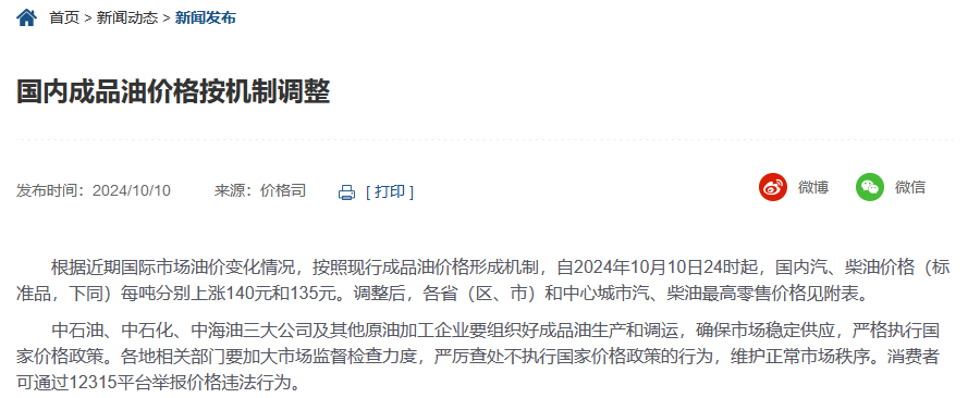 中新经纬10月10日电 据国家发改委网站10日消息,根据近期国际市场油价变化情况,按照现行成品油价格形成机制,自2024年10月10日24时起,国内汽、柴油价格(标准品,下同)每吨分别上涨140元和135元。
