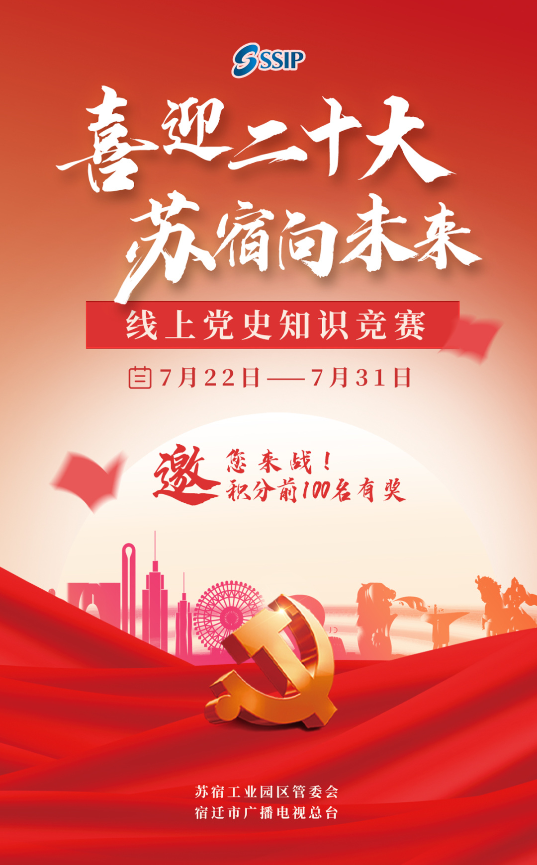 为进一步营造苏宿园区喜迎二十大的浓厚氛围,开展好“强国复兴有我”群众性主题宣传教育活动,苏宿工业园区管委会与宿迁市广播电视总台联合组织“喜迎二十大 苏宿向未来”线上党史知识竞赛活动。