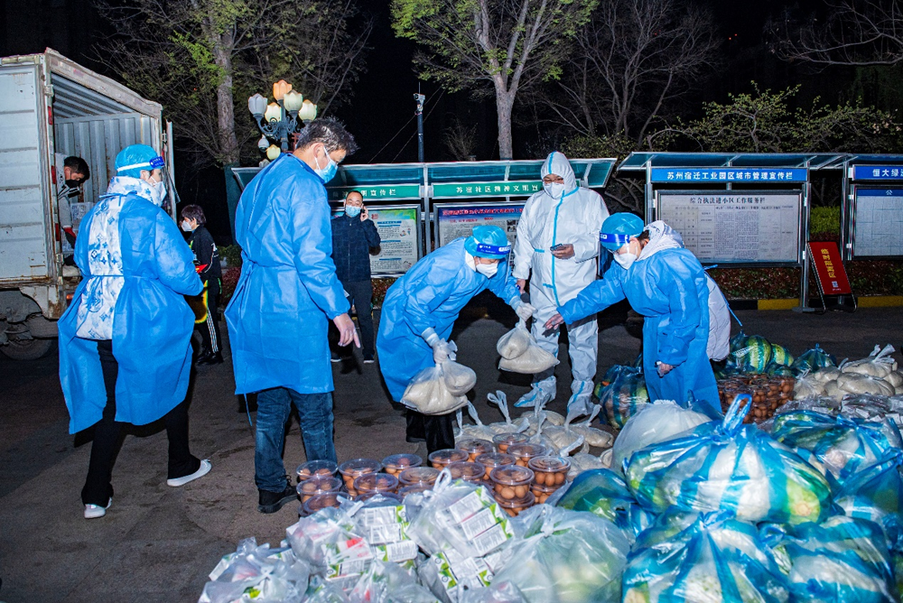 近日,苏宿工业园区管委会为区内居家健康监测人员免费发放米、油、鸡蛋、猪肉、蔬菜等生活物资,保证大家居家期间生活不受影响。