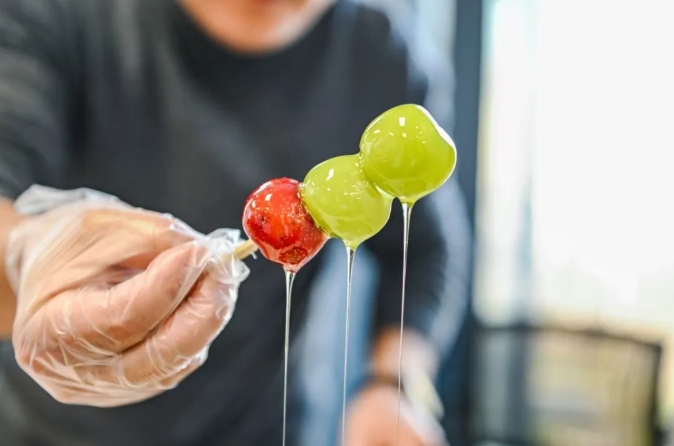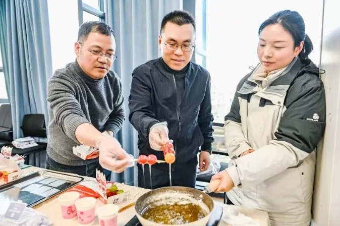 值得一提的是,本次活动还设置了DIY冰糖葫芦区域。现场,工作人员将洗好的山楂、橘子、葡萄等水果,以及竹签、熬制好的糖浆整齐地摆放在桌子上,并向孩子们详细讲解糖葫芦制作的过程。在工作人员的指导下,孩子们认真挑选水果,并将其串成串后放入糖浆中包裹均匀。不一会儿,一串串晶莹剔透的冰糖葫芦便制作完成。孩子们拿起自己制作的水果糖葫芦,迫不及待地吃了起来,脸上洋溢着幸福的笑容。