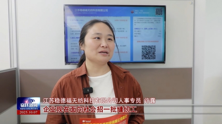 “企业现在面向社会招一批缝纫工,检验、折叠工等一系列普工的职位,希望有想找工作的朋友们,可以到我们企业来参观咨询一下。”江苏稳德福无纺科技有限公司人事专员许露说。