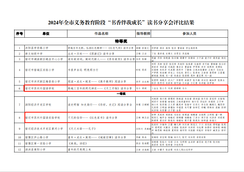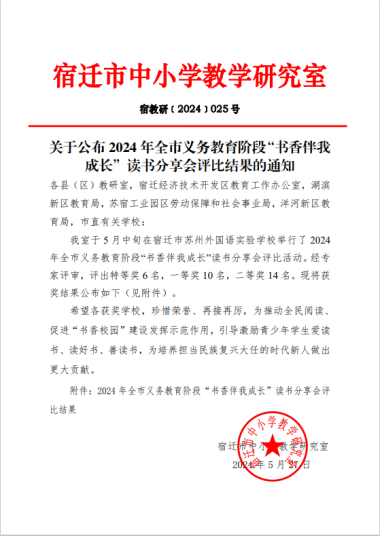近日,宿迁市苏州外国语学校教育集团在2024年宿迁市义务教育阶段“书香伴我成长”读书分享会中凭借阅读分享节目《跨越三百年的两代神农》《不灭的信仰》脱颖而出,分别获得特等奖、一等奖。