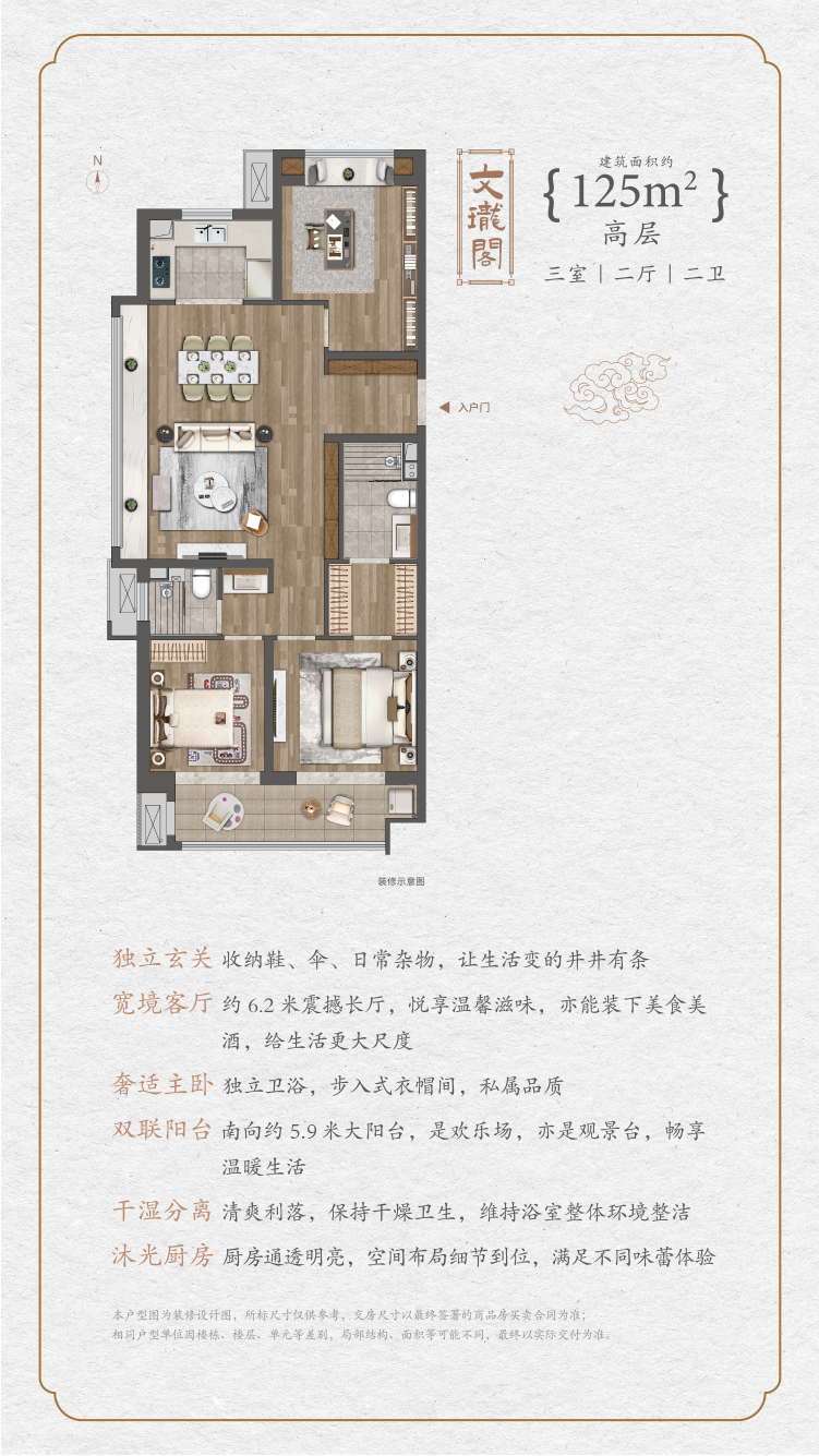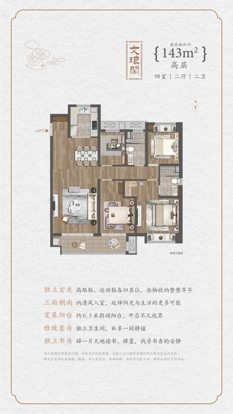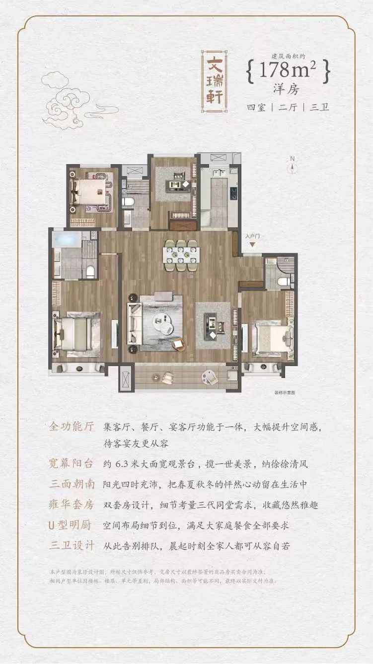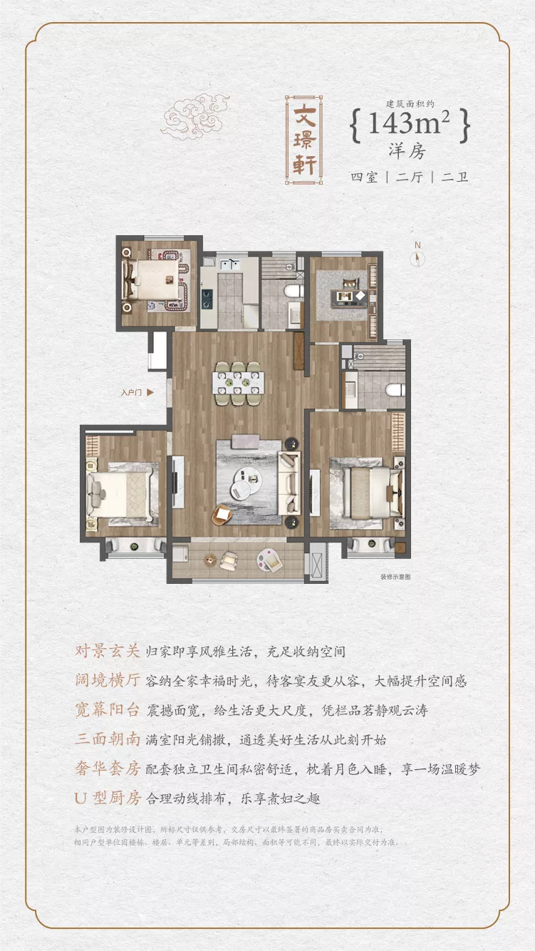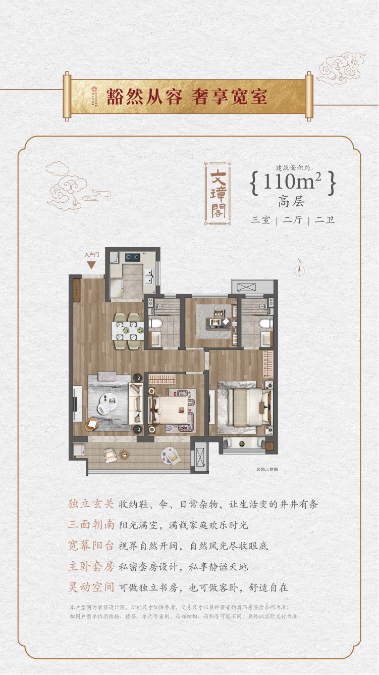 精研宿迁改善人居需求,在空间与生活的平衡考量之上,建发·文瀚府打造建面约110-178㎡国风大宅,多开间朝南,餐客一体大通厅,南向观景阳台,远瞰古黄河盛景,近观江南园林,套房式主卧,升华全家日常生活体验。配备建发物业贴心守护,以超越行业标准的钻石服务,让业主生活安心无忧。