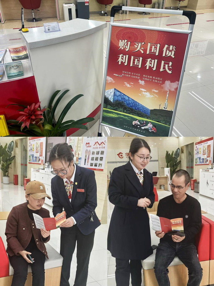 国债发售期间,厅堂人员通过晨夕会集体学习国债知识,充实知识储备,规范国债销售。在线下,以营业网点为主阵地,在厅堂设立国债知识宣传专区,播放国债宣传视频,摆放国债宣传资料,包括精美的宣传册和海报。大堂经理积极向等候办理业务的客户介绍并宣传国债的稳健性和安全性,营造良好氛围。在线上,华夏银行宿迁分行动员全体员工,积极通过微信朋友圈及客户微信群发送国债海报,让宣传更具广度、更有温度。