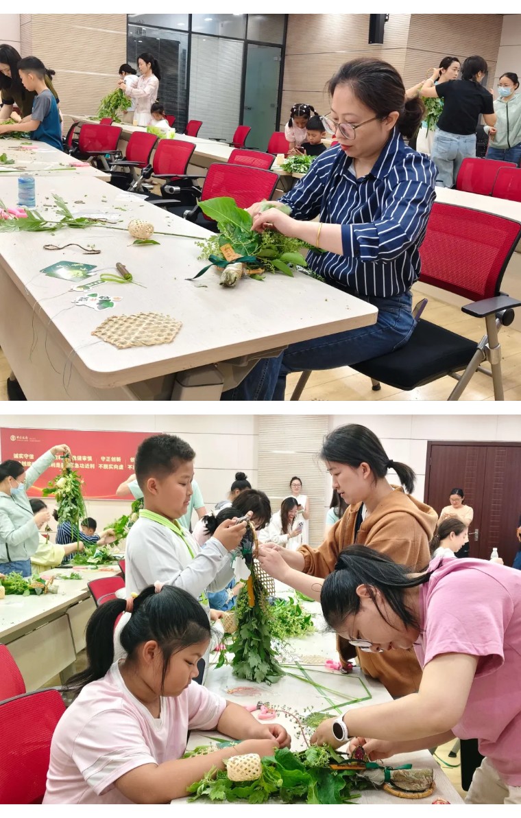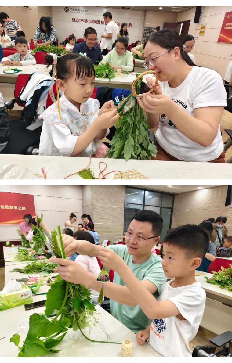 活动中,中行宿迁分行纪委书记、工会主席吴雪开与职工家属一起,聆听端午习俗讲解,了解艾草驱邪祈福背后的故事。艾草门挂DIY环节,孩子们用彩绳缠绕艾叶、串起香囊,家长细心协助,现场欢笑声不断,一个个寓意吉祥的艾草门挂在亲子协作下制作完成。