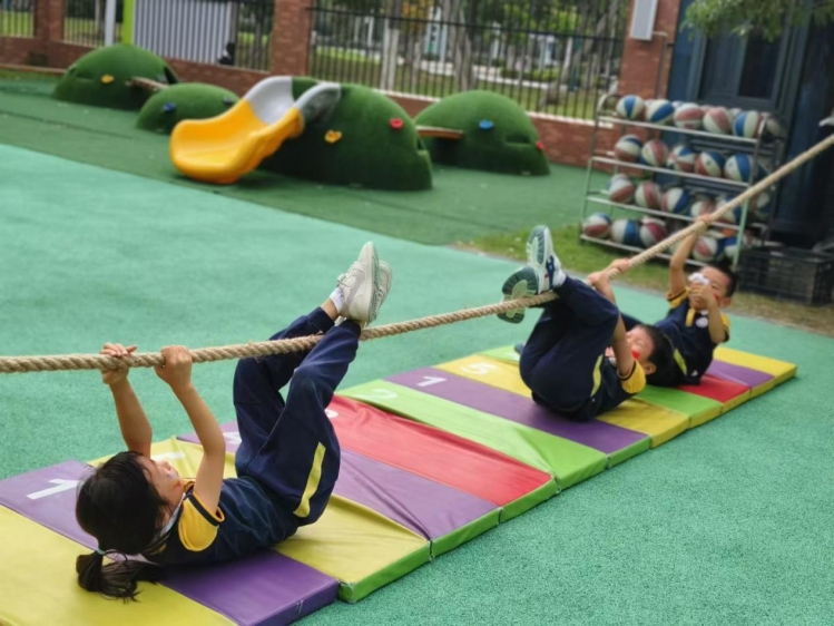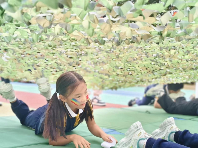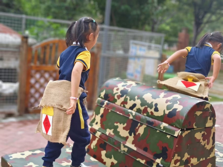 “重走长征路”游戏在户外运动区拉开帷幕。紧张刺激的游戏一触即发,勇敢的小战士们拿出高昂的气势、勇敢的精神,向着目标奋力前进!