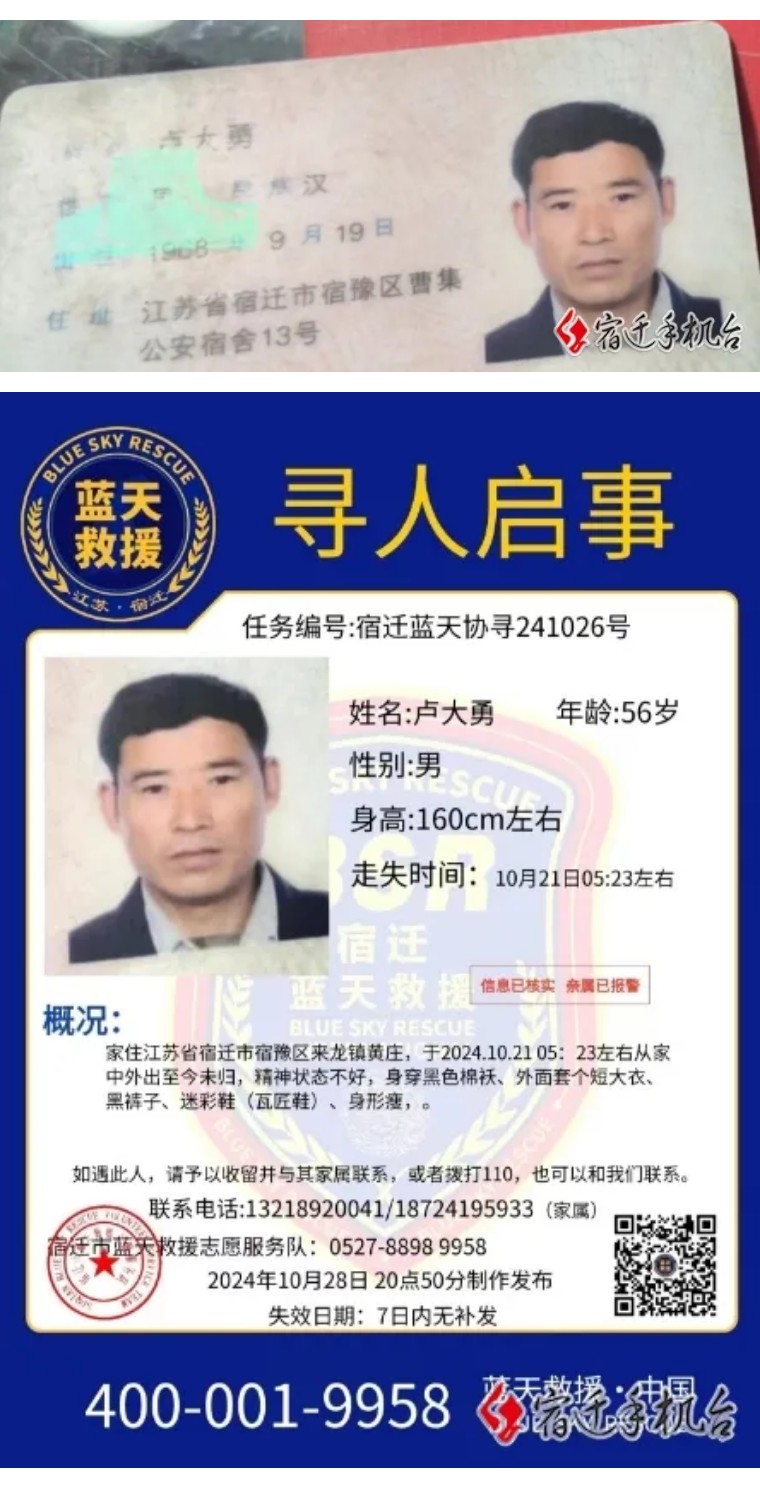 昨天,家住宿豫区来龙镇龙西村黄庄二组的卢根勇先生,向我们栏目求助,希望借助社会力量寻找他失踪近半个月的弟弟卢大勇。