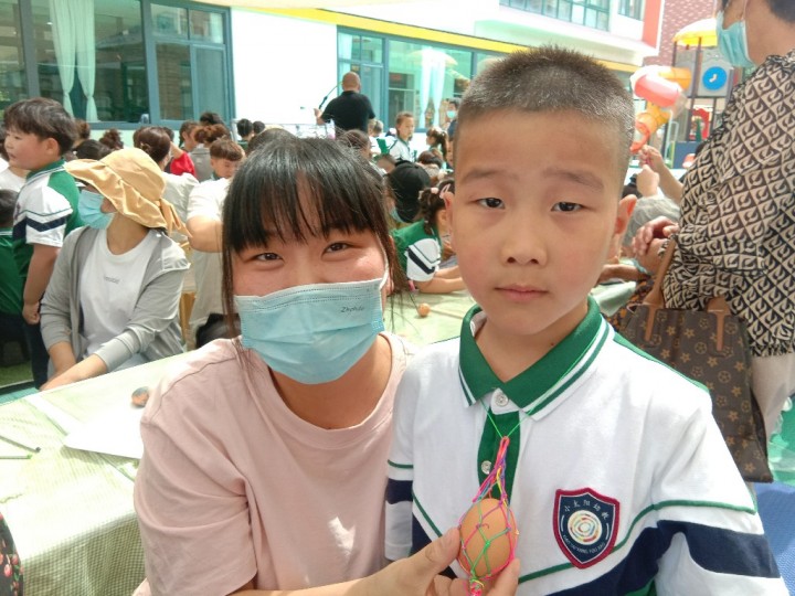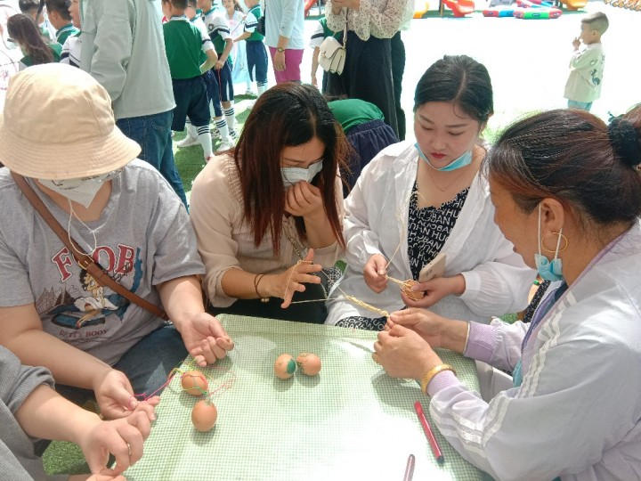 游戏过后,端午传统文化之旅便正式开始。孩子和家长们一起编织五彩鸡蛋网,同时在鸡蛋上进行彩绘,绘画完毕后再将鸡蛋装进蛋网,挂在脖上,祈福纳吉。
