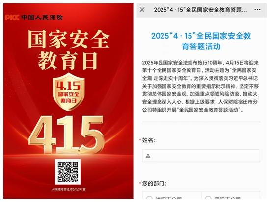 2025年4月15日将迎来第十个全民国家安全教育日,为深入贯彻落实习近平总书记关于加强国家安全教育的重要指示批示精神,人保财险宿迁市分公司积极响应号召,深入开展了一系列全面、系统的国家安全教育活动,进一步增强全民国家安全意识和素养,营造维护国家安全的浓厚氛围。