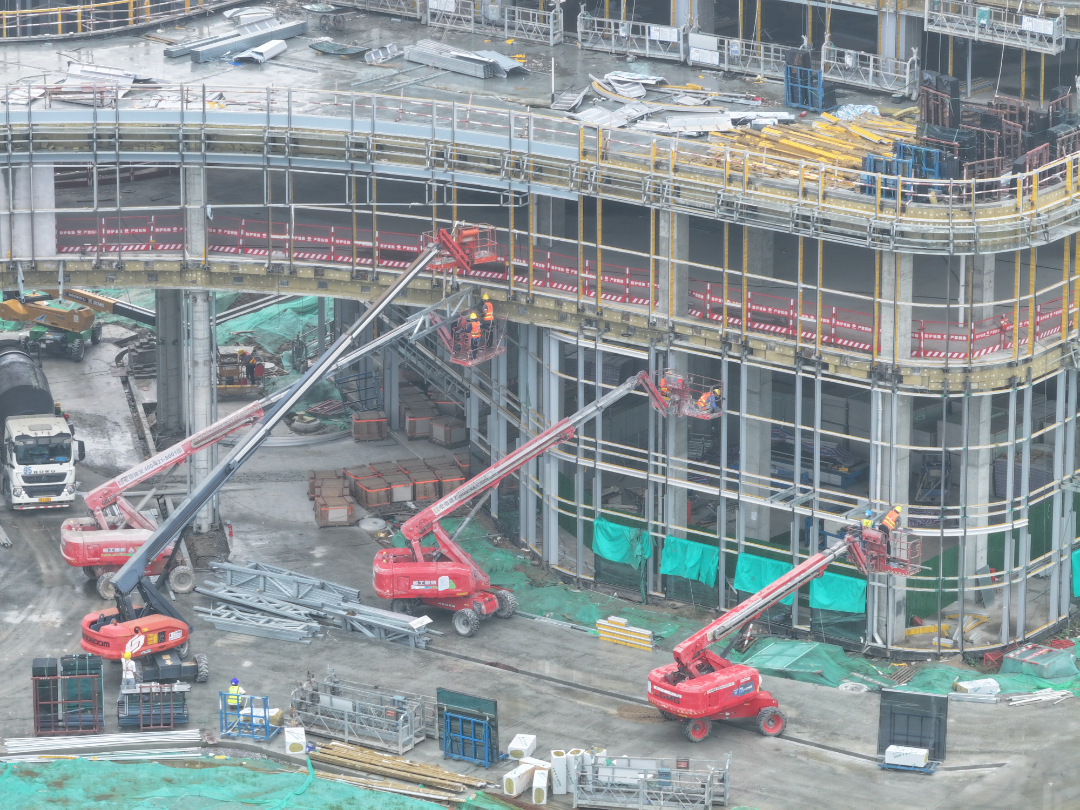 一大早,宿迁市科技创新产业园项目现场,早已是机械轰鸣、焊花闪烁,一派繁忙景象。工人们在各作业面上紧张有序地施工,全力以赴保障项目按照时间节点稳步推进。