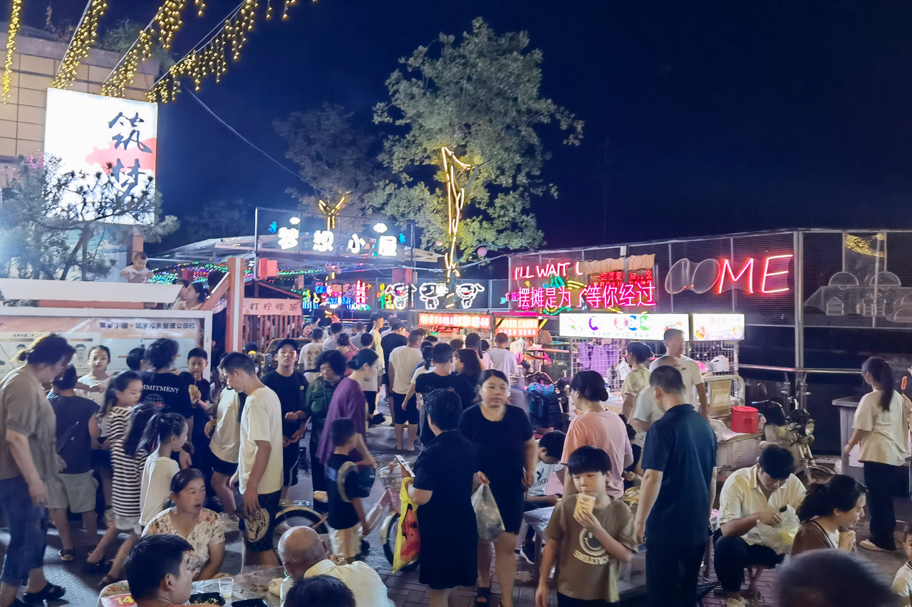 美食饮料、海鲜烧烤、创意摊位前吸引了很多人驻足购买。摊贩的叫卖声、食物油炸的滋滋声和人们对话的欢闹声……都在这里同时上演。
