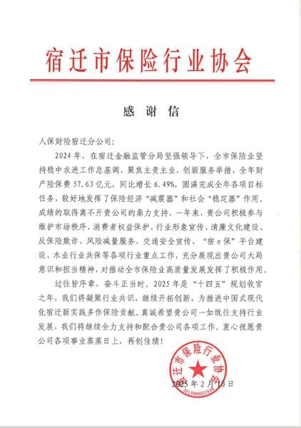 2月10日,人保财险宿迁市分公司收到了宿迁市保险行业协会发来的一封感谢信。