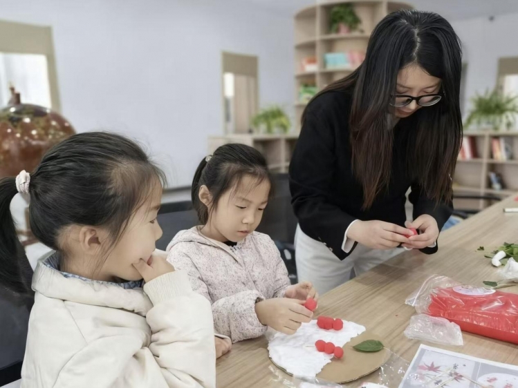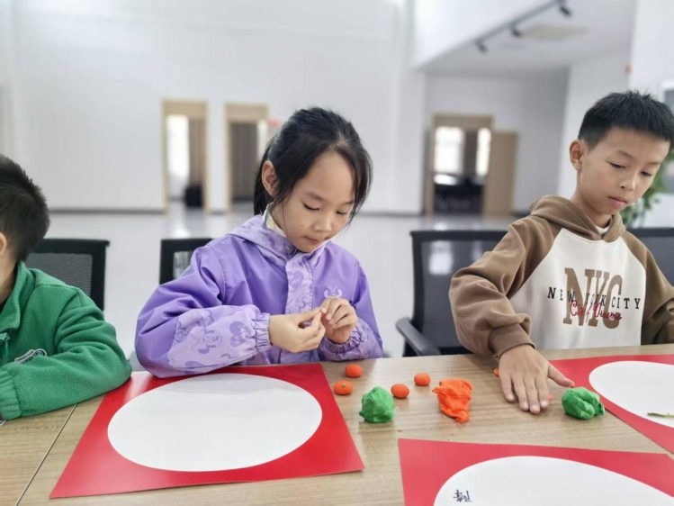 最让孩子们期待的是手工环节。在工作人员的指导下,大家先用红白卡纸拼贴出富有层次感的背景,再借助多彩黏土自由创作。有的孩子专注地揉捏橙色的黏土,塑成圆润可爱的柿子,轻轻贴上翠绿的柿蒂,不一会儿,“柿柿如意”的美好寓意便跃然纸上;有的则创意十足,将黏土搓成红果形状,串起一串串诱人的“冰糖葫芦”,重现街头秋日风味;还有的收集了银杏、枫叶等落叶,通过拼贴与点缀,构成一幅幅斑斓的秋景图。每一件作品都承载着孩子们对秋天的理解与想象,也展现出他们眼中独有的童真与创意。