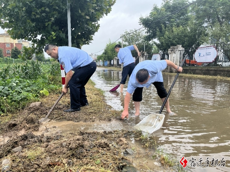 民、辅警结合辖区实际情况,赶往辖区低洼地查看积水情况,对积水路面开展排水工作,疏导堵塞河道。
