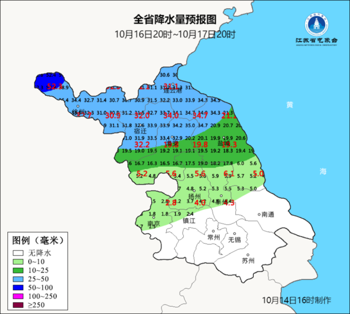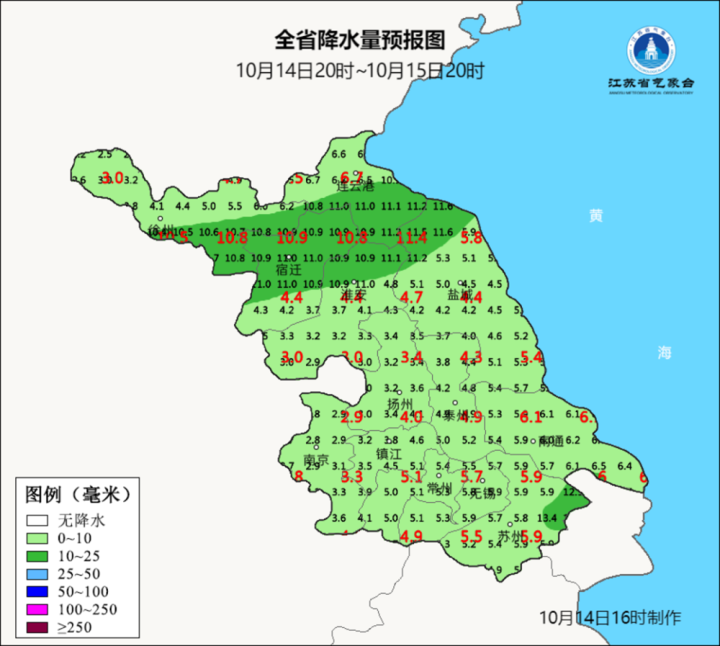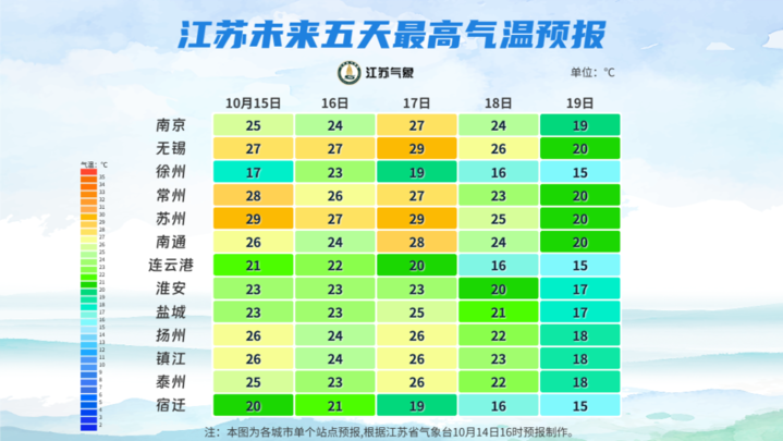 沿江以北地区阴有阵雨或雷雨,其中沿淮和淮北地区雨量中到大,局部暴雨;其他地区多云到阴。最高温度:淮北地区20~21℃,沿江和苏南地区29℃左右,其他地区26~27℃;最低温度:淮北地区18℃左右,苏南地区21~22℃,其他地区20℃左右。淮北地区偏东风4级左右转偏北风4-5级阵风6级,其他地区偏东风4级左右。