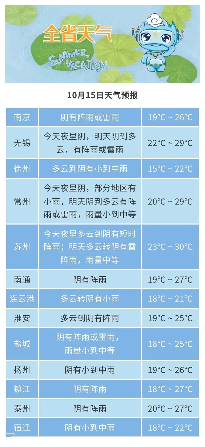 沿淮及以南地区阴有分散性阵雨并渐止转阴到多云,其他地区多云到阴。最高温度:苏南地区26~27℃,其他地区24℃左右;最低温度:淮北北部地区16℃左右,沿江和苏南地区21~22℃,其他地区20℃左右。全省偏东风4-5级。