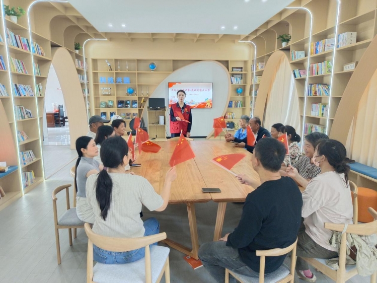 活动在激昂澎湃的歌声中拉开帷幕。“我想大声唱”传唱环节瞬间点燃了全场热情。现场居民手持国旗,在工作人员的领唱下,齐声高歌《歌唱祖国》。“五星红旗迎风飘扬,胜利歌声多么响亮……”嘹亮的歌声不仅串联起了不同年龄段的共同记忆,更将浓浓的爱国情感注入每位居民的心田。