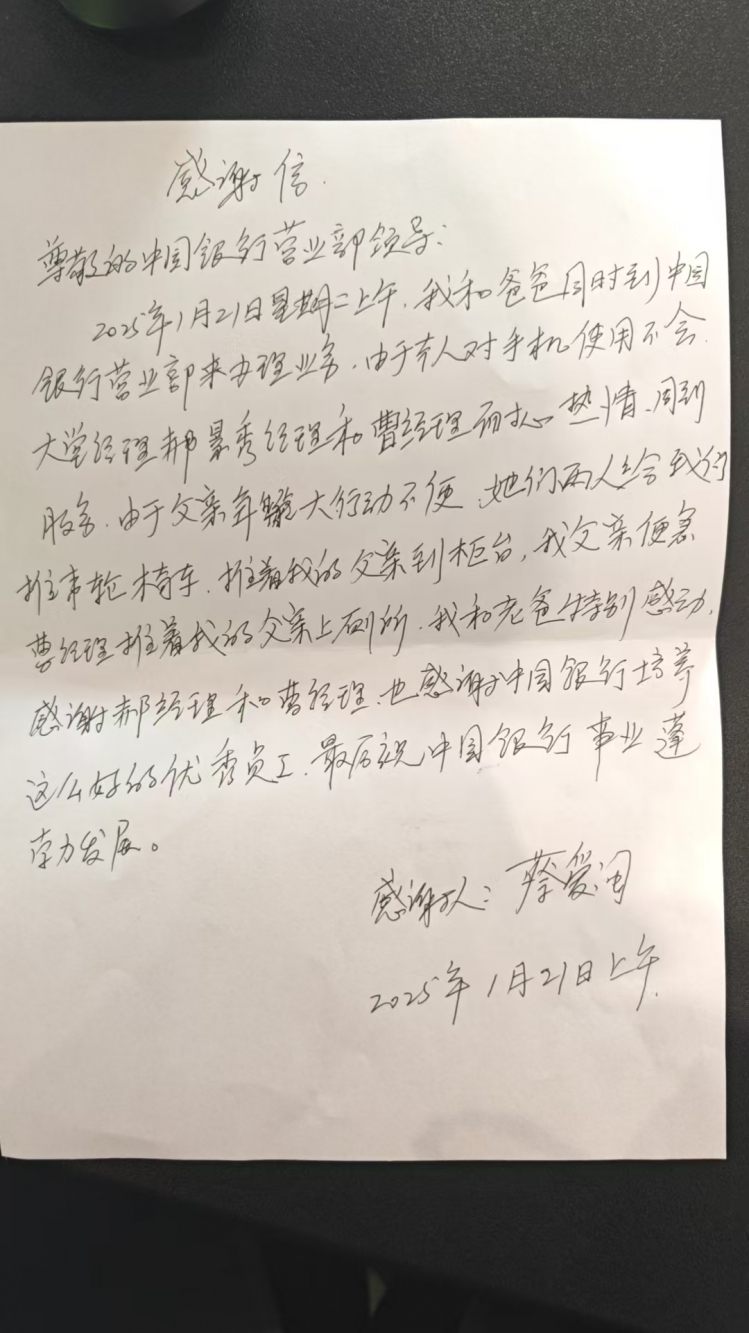 老人在感谢信中写道:“中国银行宿迁城中支行营业部的工作人员用实际行动,为我化解了一时的窘境,让我切实感受到了关怀与温暖。从这般优质服务中,我感受到了该行坚守‘金融为民’的初心。”