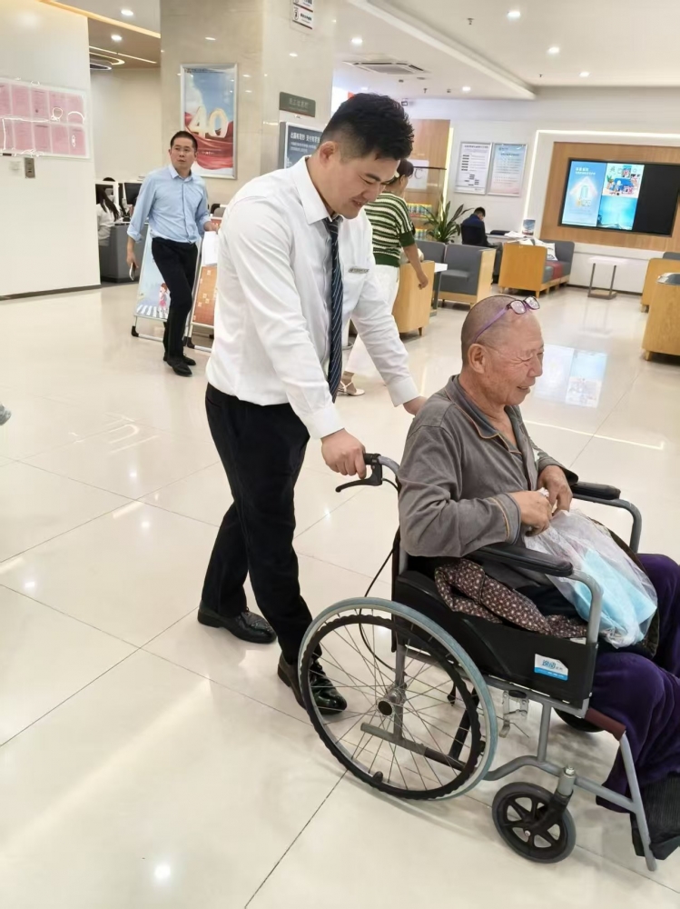 在中国银行宿迁沭阳支行营业部,总能看到一个个身影,悉心陪伴着老年人,帮助他们办理业务,为他们解答疑问。该行大堂经理李驰便是这支队伍里的一员,在与老年客户的交流中,他总是面露微笑、保持耐心,每一个动作都透着专业与细心。