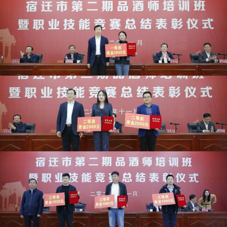 表彰仪式上,冯如意、钱信松、唐厚晨分别为获得技能竞赛一、二、三等奖学员和宿迁市技术能手学员颁奖;优秀学员代表、中小酒企主要负责人代表作表态发言。