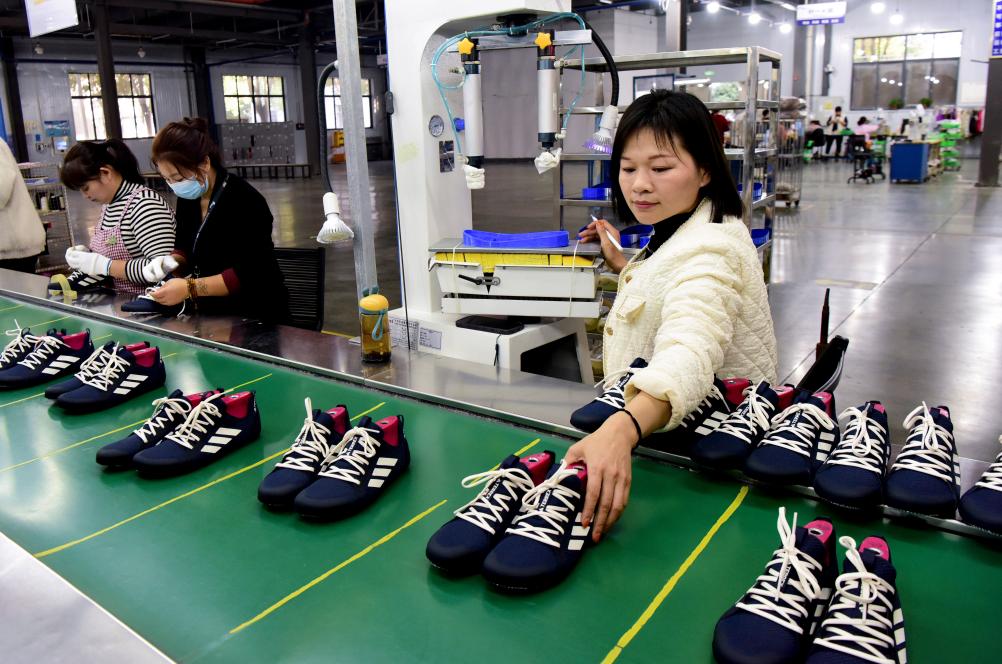 2024年10月23日,河南省上蔡县一家制鞋企业,员工正在生产线工作。新华社记者 朱祥 摄