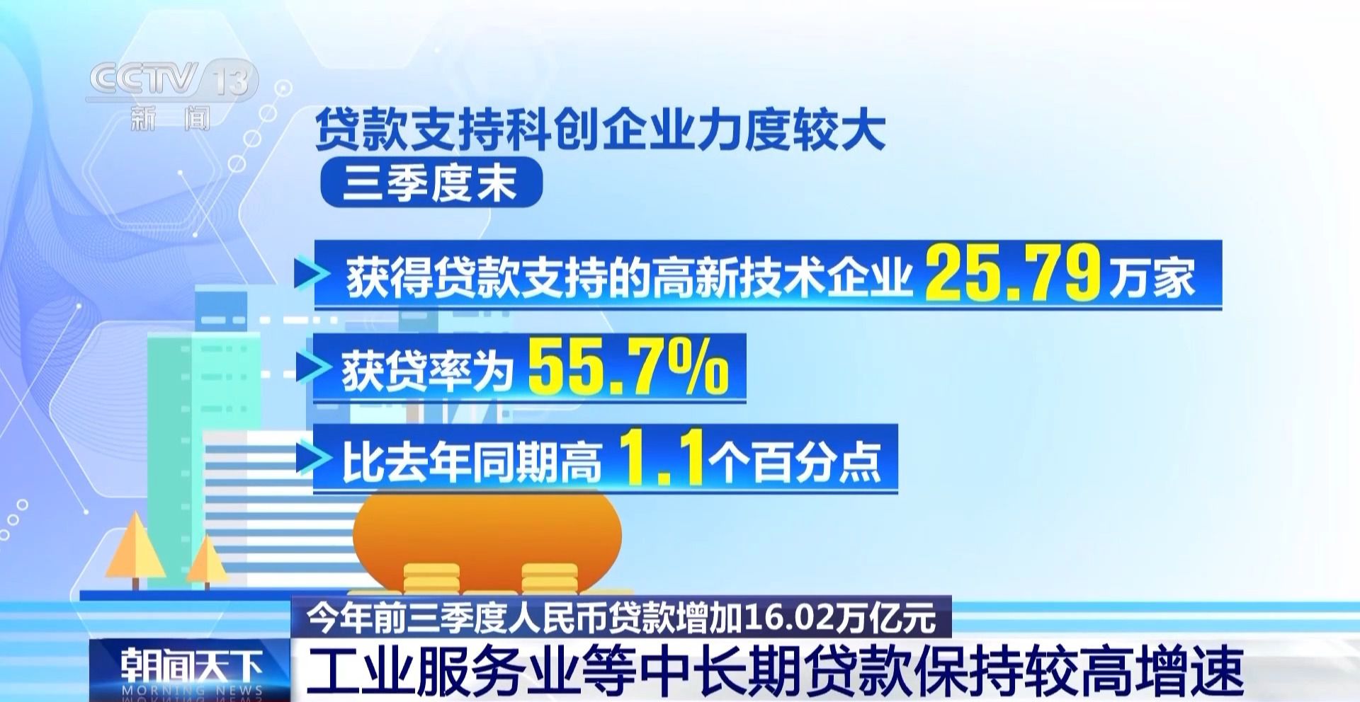 数据显示,工业、服务业和基础设施相关行业中长期贷款保持较高增速。三季度末,本外币工业中长期贷款余额24.23万亿元,同比增长15.1%,增速比各项贷款高7.5个百分点,前三季度增加2.45万亿元。