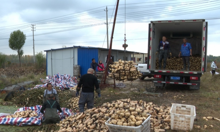 不光螃蟹迎来丰收,大沟村千亩莲藕也迎来收获。采藕、称重、装箱,每天藕塘都忙个不停,一车车莲藕发往全国各地。