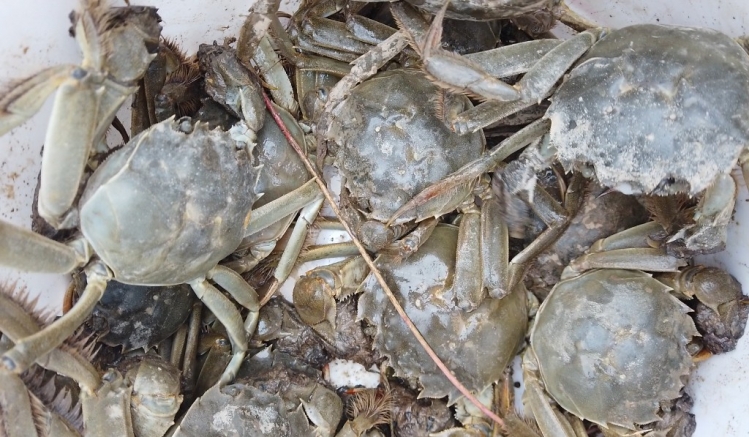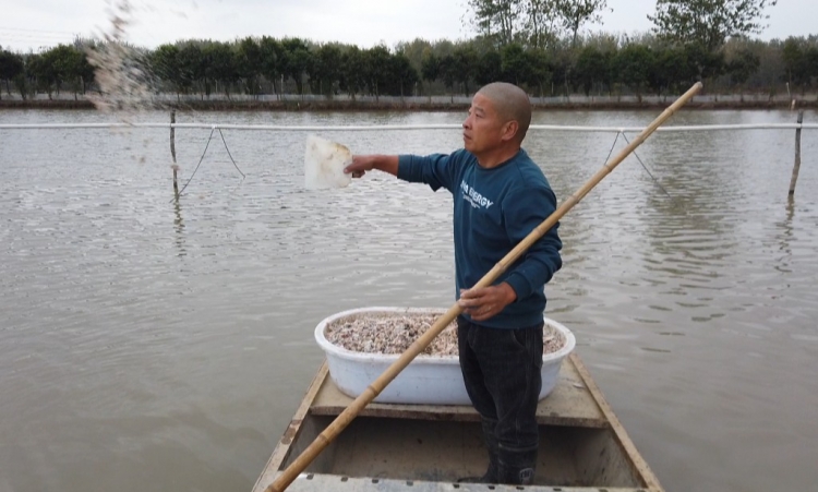 走进郑楼片区张渡村一处螃蟹养殖基地,养殖户殷华辉正在撑着小船给螃蟹喂食,带鱼、小黄鱼、玉米、黄豆……满满的塑料盆里什么都有,荤素搭配,几乎一天就需要1000斤。