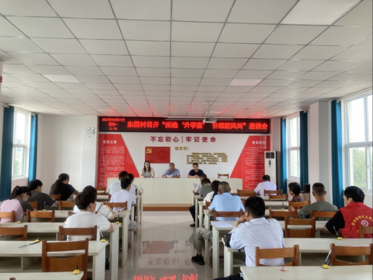 座谈会上,东园村党支部书记王飞对准大学生们生活上与学业上提出入学建议。青年志愿者向村民宣读“拒绝‘升学宴’ 引领新风尚”倡议书,倡导各位准大学生、家长自觉抵制大操大办、铺张浪费之风。