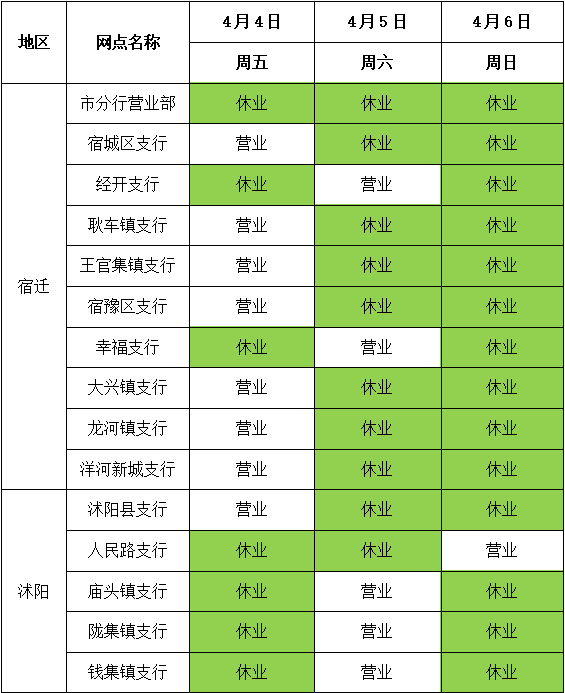 您好!现将2025年清明节期间(4月4-6日)我行辖内网点营业时间公告如下: