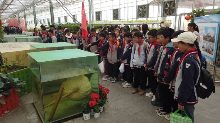 走进蔬菜馆,一个个硕大的南瓜吸引大家的目光。毕思缘是泗阳县三庄镇小学五年级学生,这次全校1030名师生来神农时代研学旅行,大家很兴奋。听导游介绍,这些大南瓜是从美国引进的品种,当时经过3个多月的培育才长得这么粗壮。种植期间,技术人员对施肥等方面进行调整,日常管理也非常仔细,确保每根藤上只留一个瓜,保留二级侧枝和三级侧枝,让南瓜得到充足的养分。