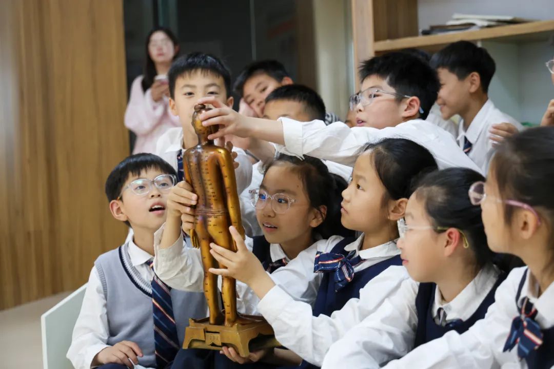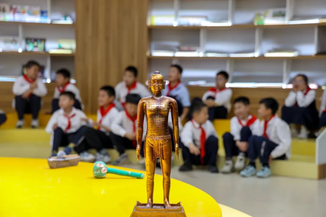 活动伊始,泗阳中医院中医师石颖带领孩子们探秘“国礼”背后的故事。一张特别的“国礼”照片吸引了孩子们的目光,一尊高达一米八的针灸铜人雕塑。作为世界上最早的医学教学模型,针灸铜人承载着中华医学千年的智慧结晶,历经岁月沉淀,依然散发着独特的医学魅力,让孩子们对古人的智慧不禁肃然起敬,也在他们小小的心中种下了好奇的种子 。