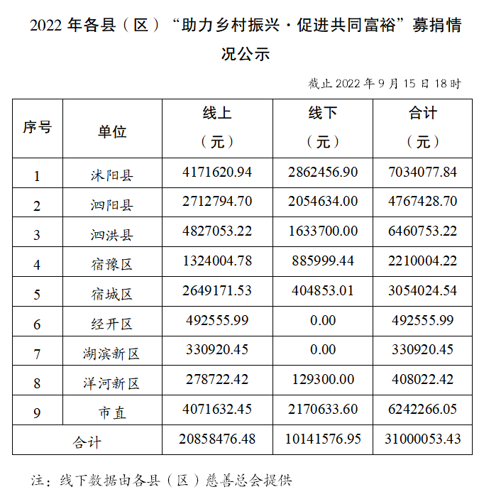 根据《中华人民共和国慈善法》规定慈善组织应当依法履行信息公开义务,信息公开应当真实、完整、及时。为弘扬慈善精神,深化慈善氛围,截止到9月15日,共收到各机关单位、企业员工、爱心人士捐款31000053.43元,现将捐款情况公示如下: