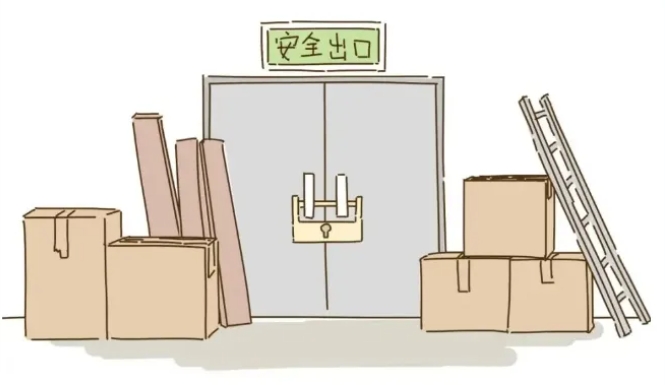 安全出口锁闭,疏散通道堆放物品影响疏散❌