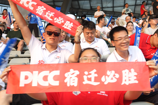 人保财险宿迁市分公司员工及员工家属身着整齐服装,手持加油横幅和标语牌,横幅上“人保财险,为宿迁队加油”等字样格外醒目。他们全情投入,齐声高呼口号,挥舞着手中的道具,为宿迁队送上最热烈的掌声和最响亮的呐喊,展现了人保财险积极向上、团结奋进的精神风貌。