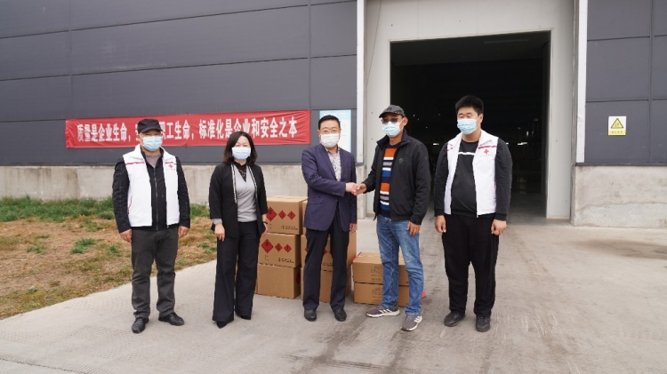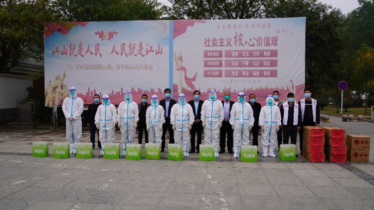现场区红十字会会长李德敏为爱心企业负责人卢宇颁发捐赠奖牌和荣誉证书,并合影留念。据了解,江苏实干家生物科技有限公司成立于2020年2月,公司致力于传染病防治的消毒剂和卫生用品的研发与生产,拥有发明专利和实用新型专利等30多项。借助先进全自动化生产灌装设备,公司每天可以实现水剂型产品日产能10万瓶,凝胶型产品日产能4万瓶。对于刚分到的消毒物资,区红十字会工作人员也是做好统计并分发部分物资到企业和核酸检测点。而斯味特果业项目负责人李晏也是代表公司,将一箱箱爱心苹果送给一线防疫人员。