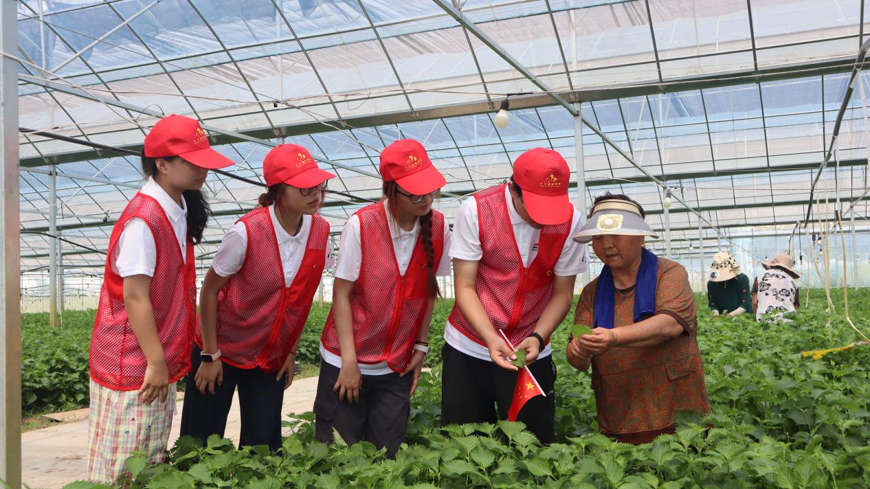 图为实践队员与当地农户在紫苏大棚中细致地观察了紫苏叶片的生长状。韩磊 供图