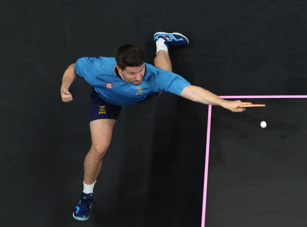 8月9日,瑞典队选手克里斯蒂安·卡尔松在巴黎奥运会乒乓球比赛中。新华社记者郭昱摄