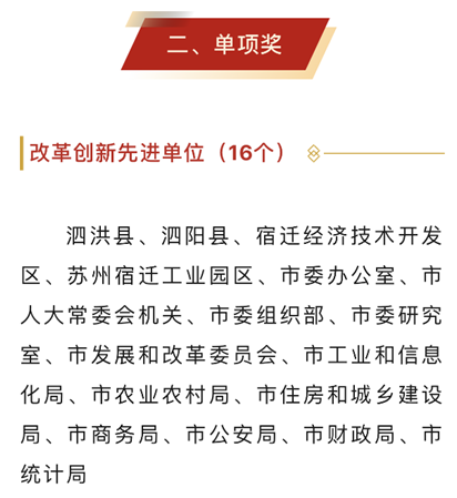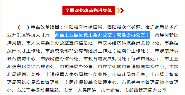 办理全国首个电子印章商标申请注册,发布全国首个共建园区建设领域地方标准《共建园区建设指南》,创成全省共建园区首家省级人力资源产业园,建成省级“金牌劳动人事争议调解组织”2个,为进一步打响宿迁经验、宿迁改革、宿迁标准品牌作出积极贡献。