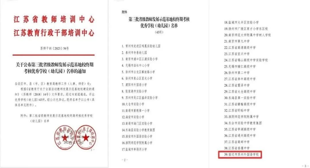 创新成立宿迁市苏州外国语学校教育集团,建成投用宿迁市苏州外国语实验学校、阳澄幼儿园,提供义务教育阶段学位5200余个、学前教育学位540个,创成优质幼儿园4所,主持、参与国家和省级课题16项,教育供给优质均衡特色化水平不断提升,中考各项指标保持全市前列,篮球队U8、U12组连创全省第二佳绩。