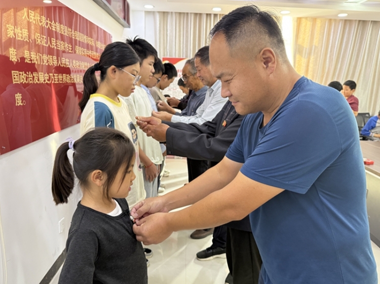 随后,温馨的“生日仪式”登场。全体参与者共同唱响《歌唱祖国》,为祖国献上生日祝福。现场党员代表手持鲜艳的国庆生日徽章,逐一为青少年佩戴。当徽章别在胸前的那一刻,孩子们脸上洋溢着自豪的笑容,也在心中种下了向党组织靠拢的种子。