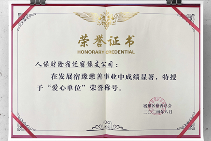 近日,人保财险宿迁宿豫支公司应邀参加“江苏慈善周”宿豫区宣传专场暨爱心捐赠活动,并荣获宿豫区慈善总会颁发的“爱心单位”荣誉称号。