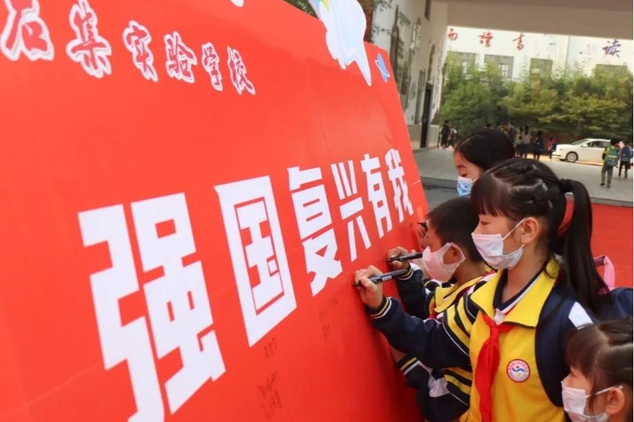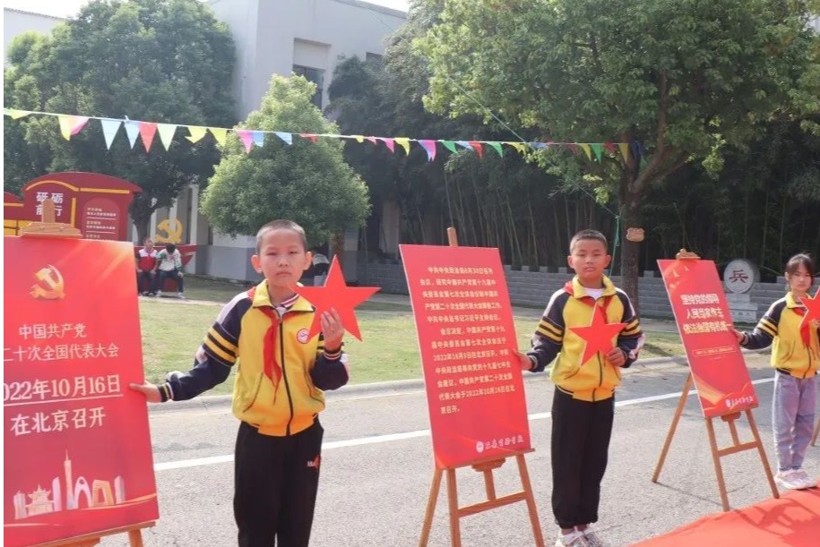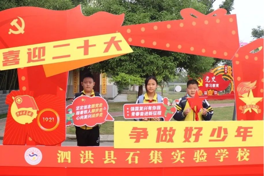 为了充分宣传二十胜利召开的重要意义,积极营造喜迎二十大的浓厚氛围。泗洪县石集实验学校聚焦“喜迎党的二十大,争做时代好队员”,以“强国复兴有我”为主题,开展了“打卡签名,复兴有我”、“同升国旗,强国有我”、“主题队课,筑梦有我”等系列活动。