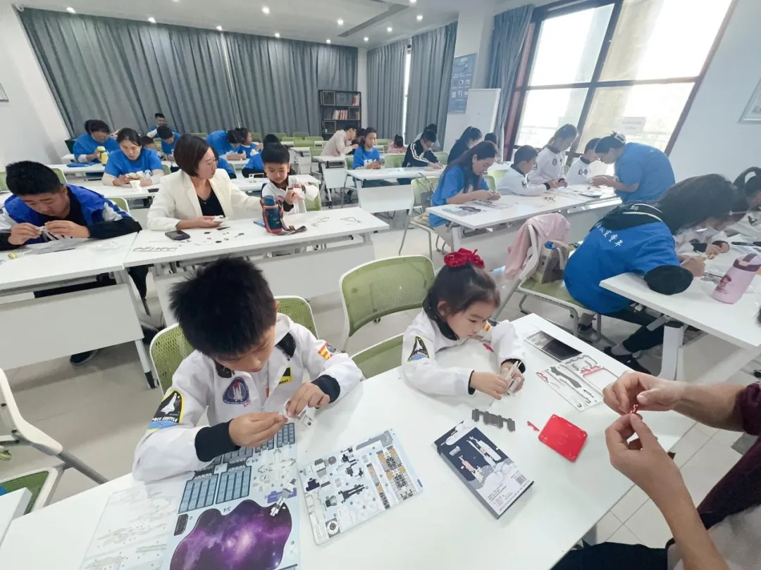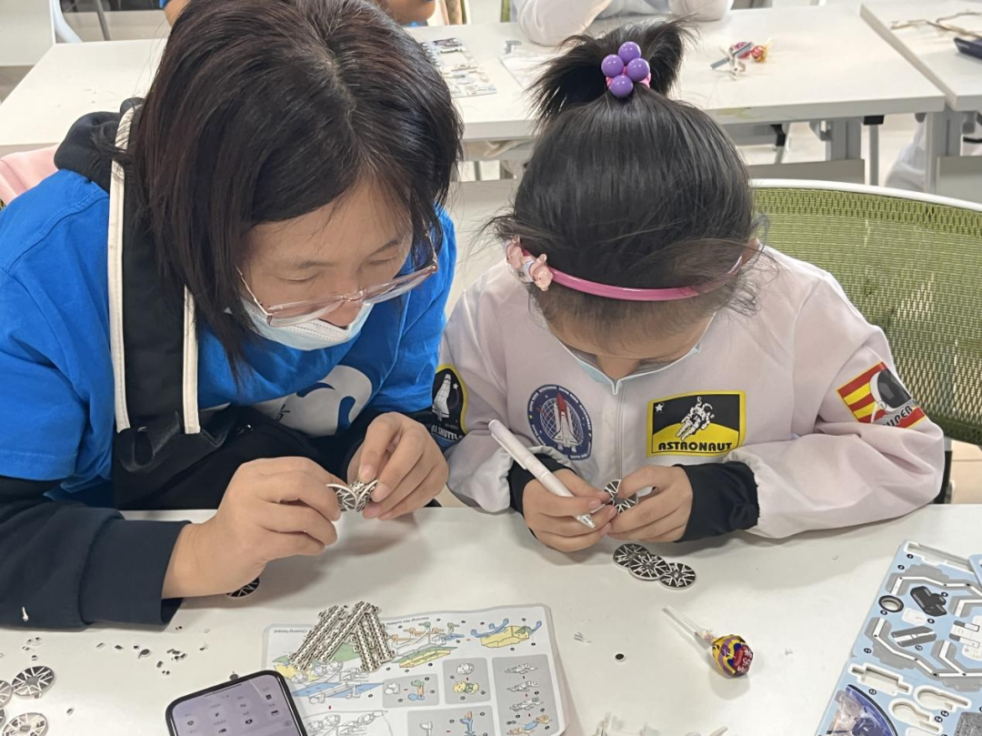 值得一提的是,本次活动还设置了亲子互动环节,孩子们和家长们共同制作航天飞机和宇宙飞船的模型。在动手过程中,亲子密切合作,不仅锻炼了孩子们的动手能力,更让他们感受到了合作的乐趣、家庭的温暖。