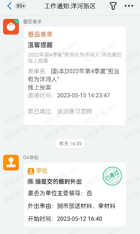 巧用“钉钉”助手,考核管理转作风。开通考勤打卡、外出审批、请假申请、会议签到等功能模块,通过层级管理层层审批,加强对干部日常监督管理,按月公示考勤情况,对表现慵懒的干部进行提醒谈话。制定计划督查,压实责任强担当。制定重点工作待办事项提醒制度,切实解决工作中不担当、慢作为等问题,待办事项由交办领导及作风办进行督查,落实责任到人。树立先进典型,激活内生动力。按季度将平时考核与“担当有为洋河人”评选深度结合开展,利用“钉钉”平台开展“担当有为洋河人”线上票选,选出党员群众公认度高的人选。