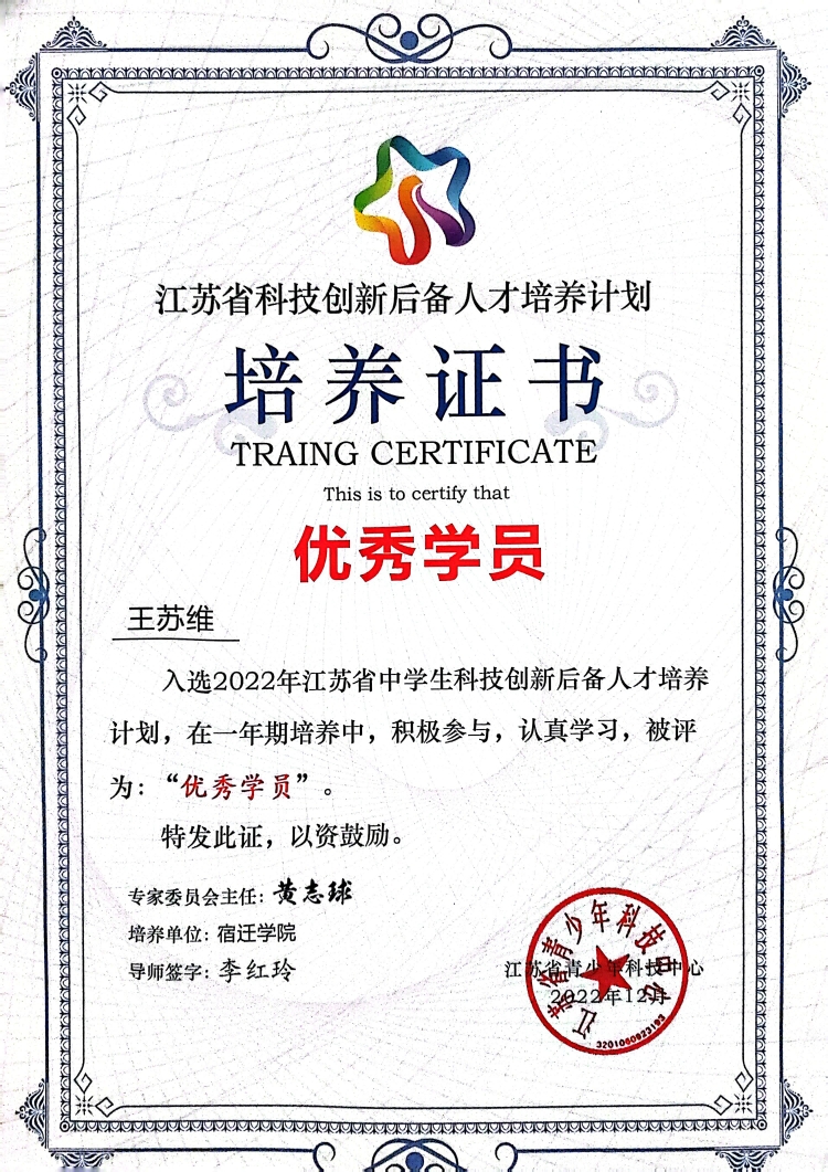 2022年省中学生科技创新后备人才培养计划圆满完成了各项任务,沭阳建陵中学共有2人加入了2022年省中学生科技创新后备人才培养计划,顺利完成了相关课题研究,其中王苏维同学获评优秀等第(全市高中唯一学生)。