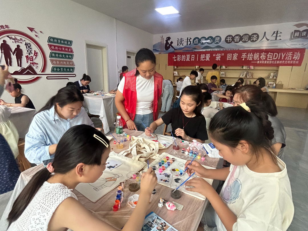 活动伊始,社区志愿者详细地介绍了手工帆布包的各种材料、制作方法、绘画技巧及相关注意事项。随后,在志愿者的协助下,孩子们充分发挥创意和想象力,用画笔蘸上五彩斑斓的颜料,在帆布包上进行创意手绘,大家在DIY的过程中感受艺术之美,展现才能。孩子们虽然是第一次做,但很快就上手,个个屏气凝神,格外投入。“我画得好看吧,颜色要丰富才漂亮。”孩子们相互交流构思创作,兴趣盎然。在一片欢声笑语中,原本色调单一的帆布袋点缀上一幅幅生动有趣、色彩鲜艳装饰画。