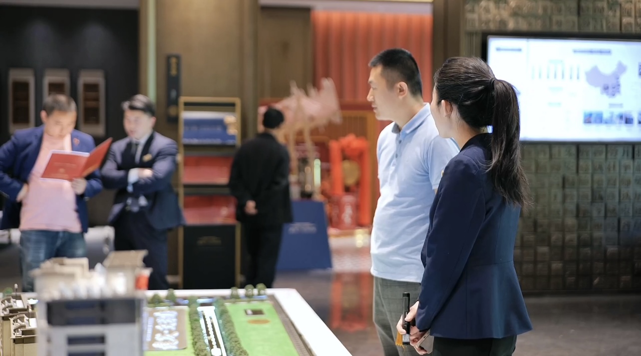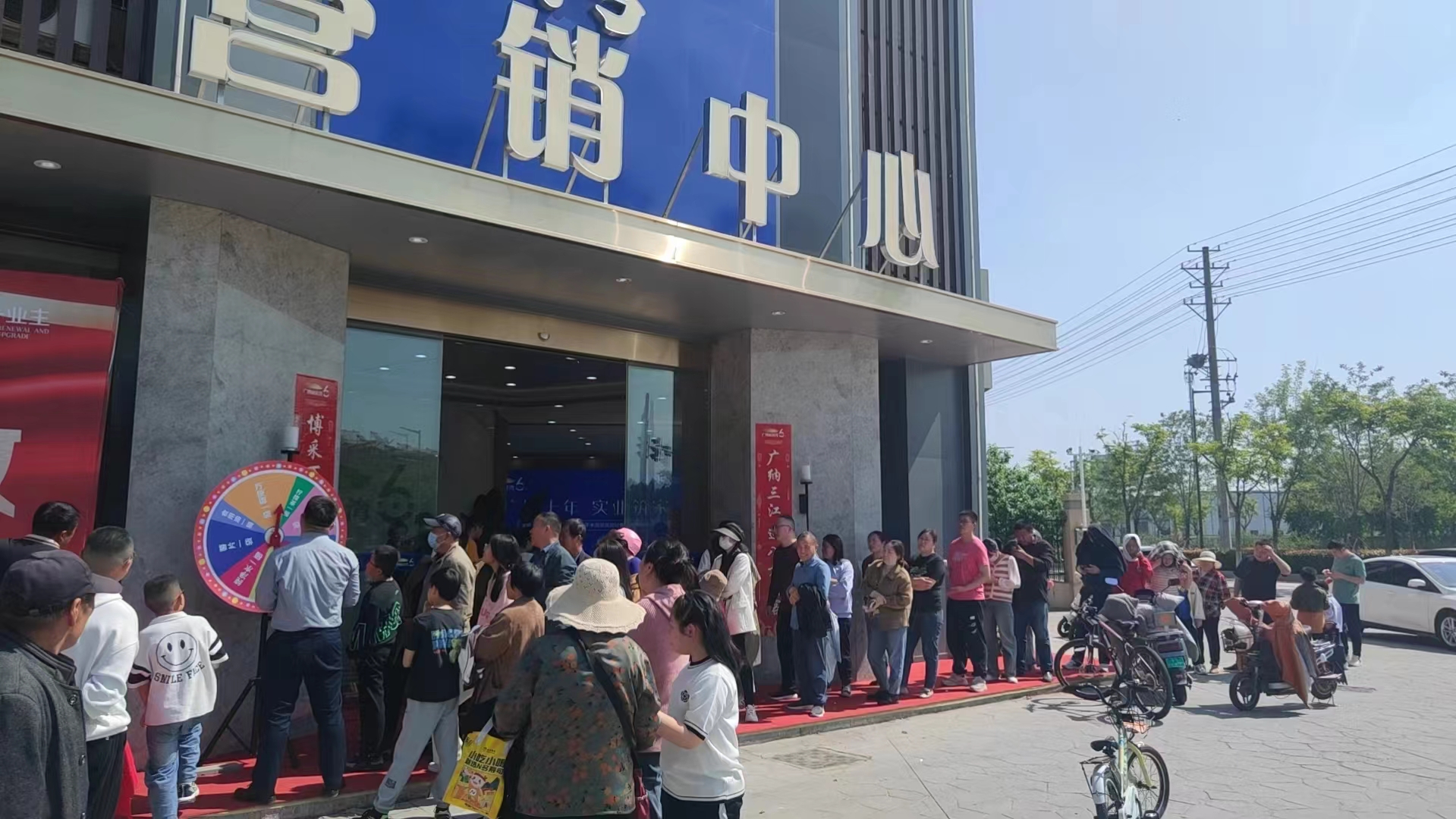 在建发誉璟湾售楼部,营销人员别出心裁,开展为期三天的王婆说媒活动,准现房加高品质定位,买即送30克金条+上海亲子3日游,活动现场人声鼎沸,线上直播间人气高涨。