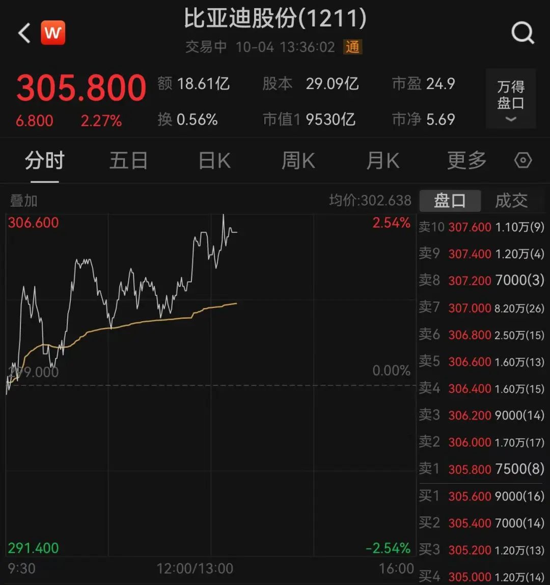 二级市场上,10月4日,截至发稿前,港股比亚迪股份股价上涨2.27%,报305.8港元,最新市值为9530亿港元。